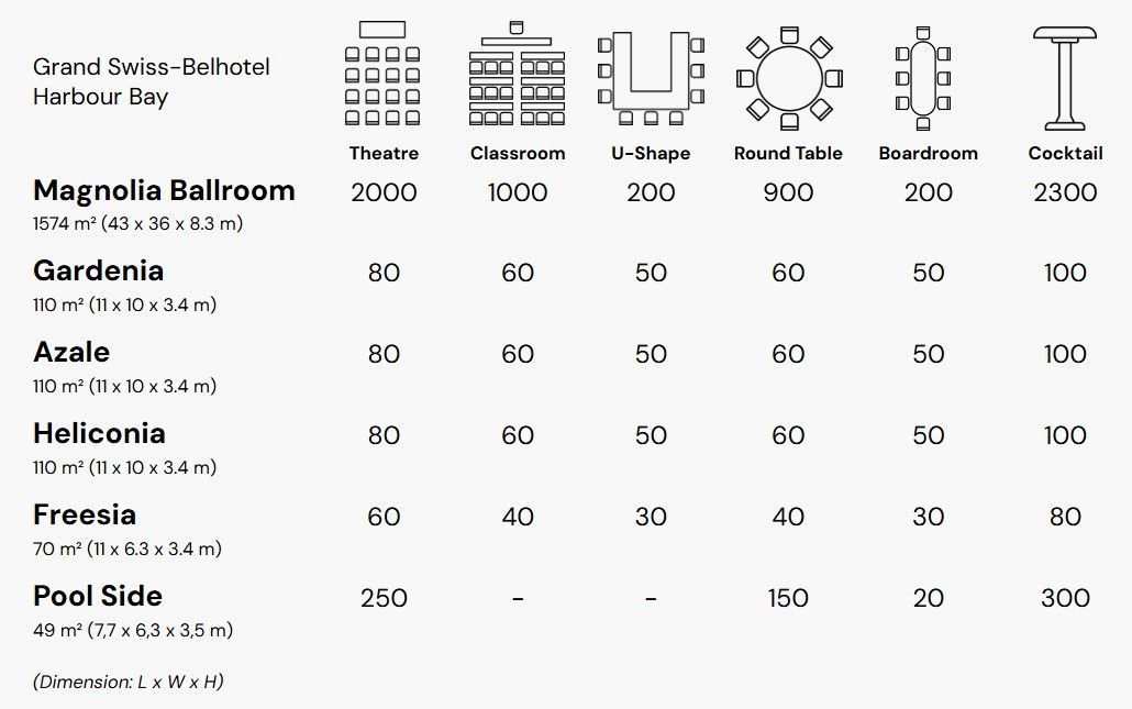 Selenggarakan acara bergengsi Anda di Magnolia Ballroom kami di Grand Swiss-Belhotel Harbour Bay Batam. Dirancang dengan elegan dan dilengkapi fasilitas modern, ruangan ini dapat menampung hingga 2.300 tamu, ideal untuk pernikahan, konferensi, dan makan malam gala. Terletak di jantung Batam, ruangan ini menawarkan perpaduan sempurna antara kemewahan, kenyamanan, dan kecanggihan.