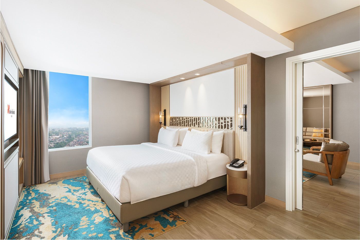 Our 57.5m² Business Suites offer stylish comfort with a master bedroom, separate living area, and a bathroom featuring both a bathtub and power shower. Panoramic windows showcase stunning city views for a truly elevated stay.